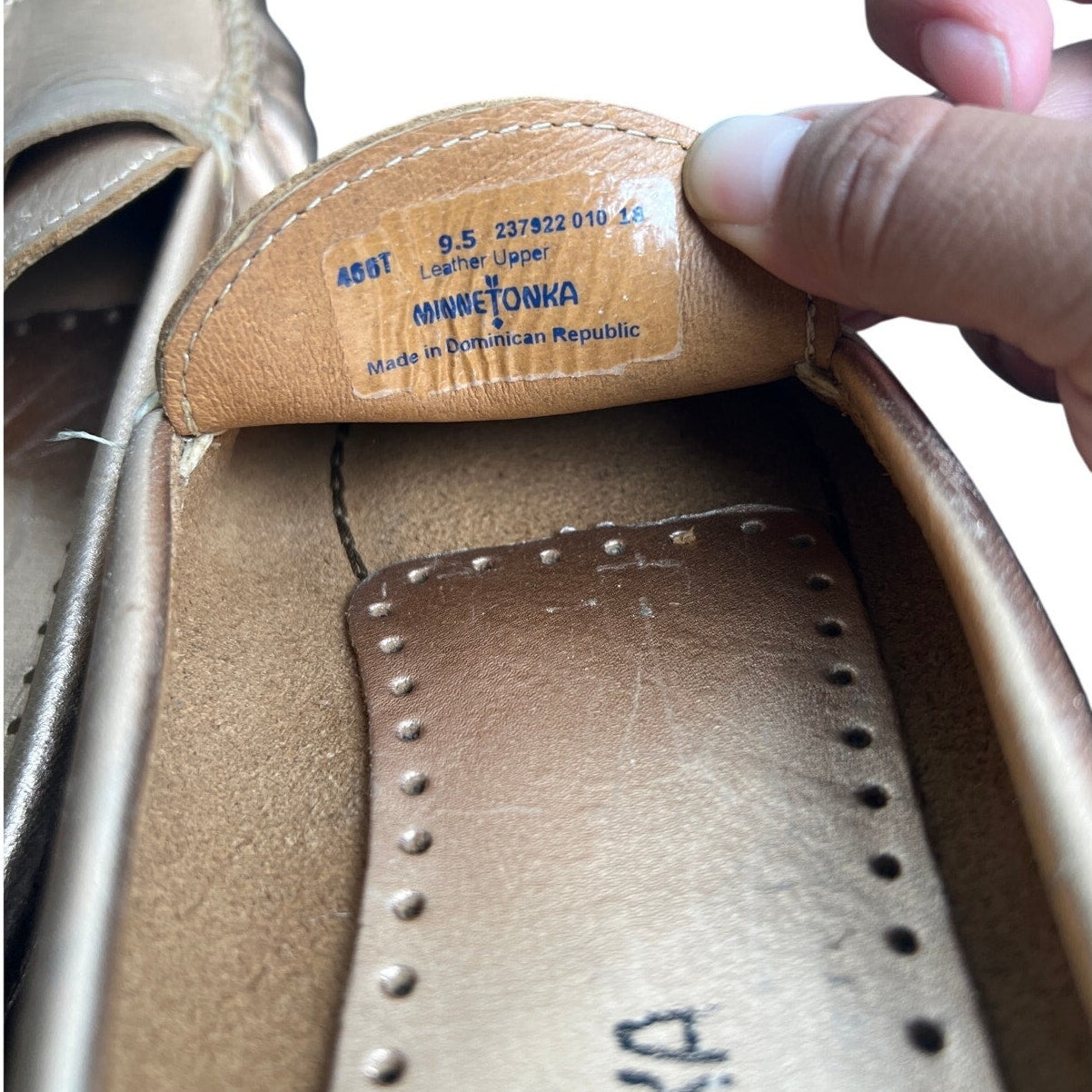 In Pre-Owned Condition. see photos for an accurate representation of the Condition of the Minnetonka Gold Leather Upper Kate Mule Women's Size 9.5