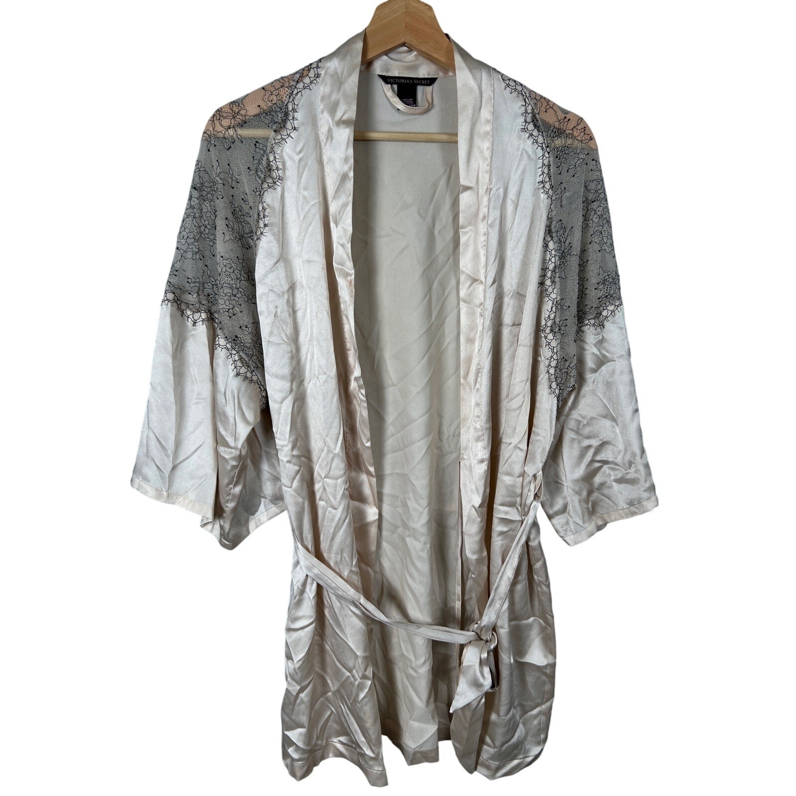 BUY IT NOW and begin wearing this Victoria Secret XS/S Light Pink Satin Robe Kimono Short Black Lace Silky in the days ahead!
